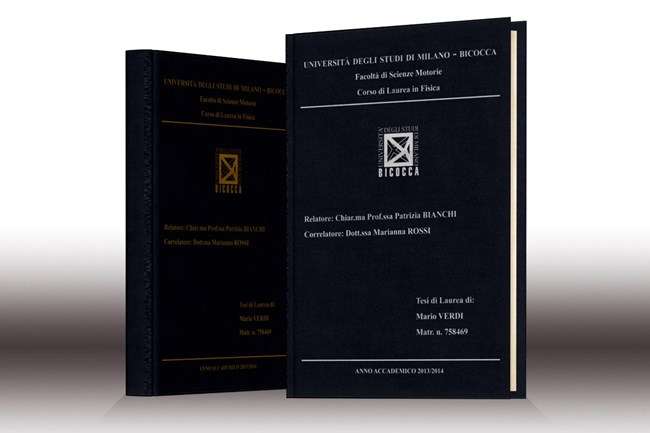 • La copertina è un elemento importante per la presentazione della tua tesi. Puoi scegliere tra diversi materiali, come la vera pelle, il velluto o la similpelle, e vari colori. La copertina in vera pelle è particolarmente apprezzata per la sua eleganza e durabilità. Aggiungi il titolo della tesi, il tuo nome e l'anno di laurea per un tocco finale personalizzato.